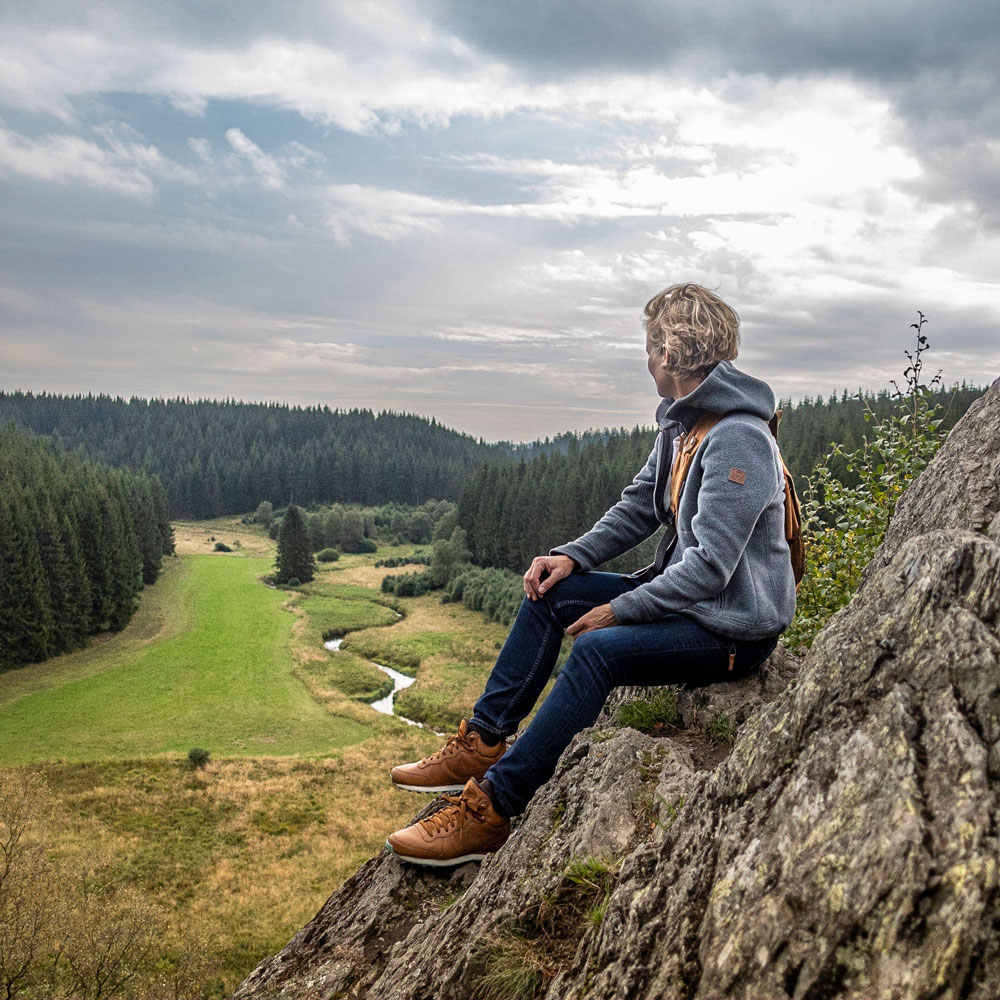Die Struktur des Loden-Gewebes im Inneren des Stoffes bleibt durch das Walken unverändert und erlaubt nach wie vor einen ungehinderten Austausch der eigenen Transpiration – selbst bei anstrengenden Wanderungen. Der Effekt ist damit eigentlich ganz ähnlich wie bei einer sehr luftigen Membran, nur dass sie komplett ohne chemische oder synthetische Fasern oder gar Chemikalien wie Flourcarbone auskommt. Die erwähnte Absorptionsfähigkeit der Wollfaser sorgt zudem dafür, dass sich der Stoff am Körper bis in extreme Nutzung hinein noch trocken anfühlt. Die aufgenommene Feuchtigkeit wird durch die Körperwärme kontinuierlich wieder verdunstet und in die Umgebung abtransportiert.