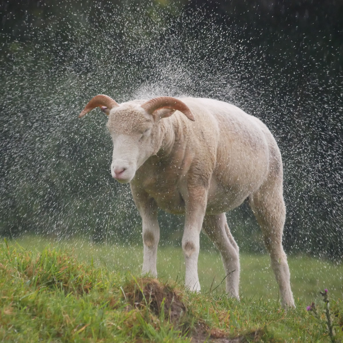Das Lanolin in der Wollfaser hat wasserabweisende Eigenschaften und bremst den Regen schon beim Auftreffen auf die Kleidung. Der wahre Vorteil ist aber ein ganz anderer, denn Wolle versucht erst gar nicht, das Wasser draußen zu halten, wie es z.B. eine Regenjacke tut, sondern arbeitet mit ihm. Wolle ist in der Lage, bis zu einem Drittel seines eigenen Gewichts an Wasser aufzunehmen, ohne sich dabei überhaupt nass anzufühlen! Wenn der Stoff dann – wie bei gutem Loden üblich – recht dicht gewebt und auf der Oberfläche gewalkt, also kontrolliert verfilzt ist, kommt ein weiterer wirksamer Effekt hinzu: Durch die Sättigung der äusseren Fasern entsteht nach einer Weile eine natürliche Barriere für nachdringende Feuchtigkeit, die den Prozess des Durchfeuchtens noch mal ausbremst. Obwohl der Stoff außen nass wirken kann, ist er im Inneren immer noch trocken.