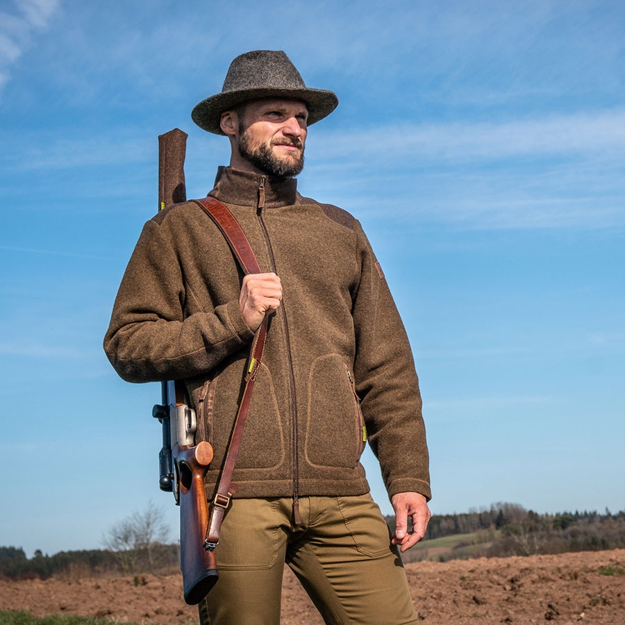 Die Jacke hat einen sportlichen, modernen Schnitt und bringt ausreichende Bewegungsfreiheit mit, so daß sie besonders während der Jagd angenehm zu tragen ist. Zwei große, mit echtem Leder eingefasste Reißverschlußtaschen bieten Platz für einige Utensilien und wärmen im Winter die Hände. Im Ellenbogen-, Schulter-, und Halsbereich haben wir den Oberstoff noch zusätzlich mit Belegen aus normalem Loden, ebenfalls aus reiner Schurwolle, verstärkt. So werden die stark beanspruchten Stellen zusätzlich gegen Abnutzung geschützt. Die Hauptelemente der Jacke sind doppelt genäht und neben der Hauptnaht zusätzlich mit einer sogenannten Coverlock-Naht versehen, die nicht nur sehr chic aussehen, sondern zugleich eine zusätzliche Sicherung aller Nähte bewirken. Selbst, wenn einmal eine Naht im Geäst hängen bleibt, liegt darunter noch eine zweite, zusätzliche Sicherung.Schnittform und Größen