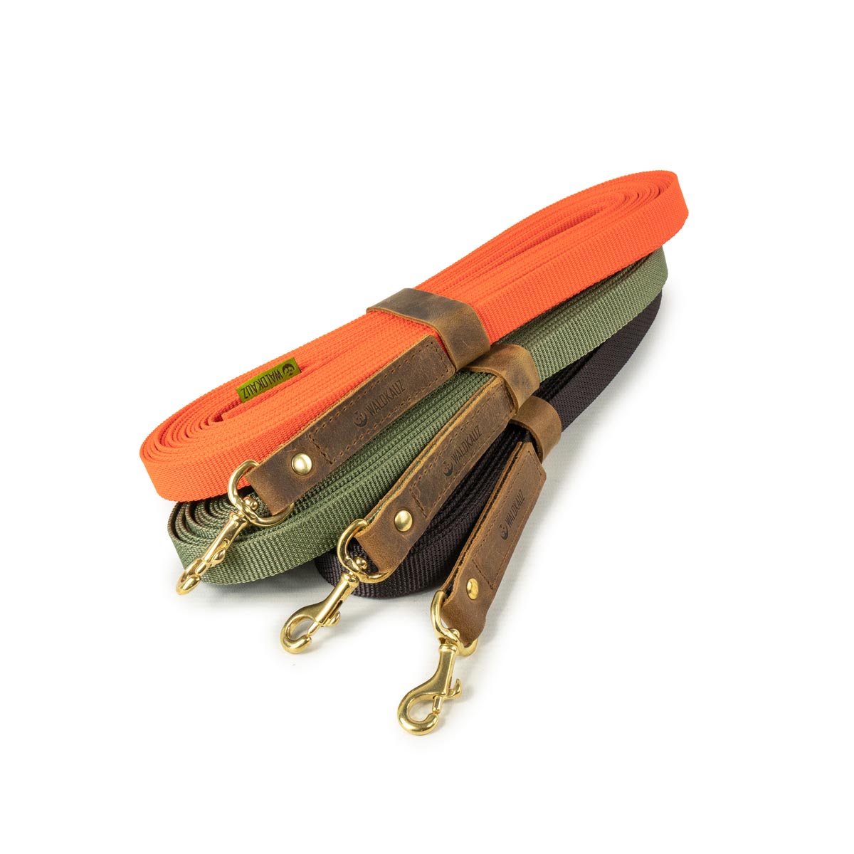Die Leine ist aus einfach gelegtem Gurtband gefertigt. Auf eine Handschlaufe haben wir bei dieser Länge bewusst verzichtet, damit die Gefahr von Hängern bei der Schweißarbeit minimiert wird und der Riemen ungehindert durch Gras und Dickung gleiten kann. Das Ende des Riemens ist lediglich umgeschlagen und vernäht, um ein Ausfransen zu verhindern. Der Karabiner ist mit einem Besatz aus Fettnubukleder vernäht und zusätzlich mit einer Niete verpresst.