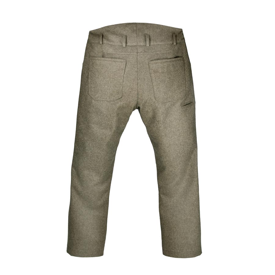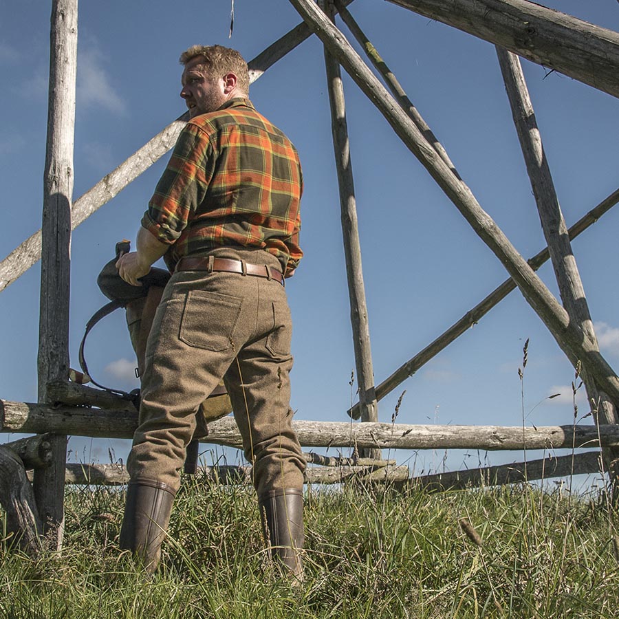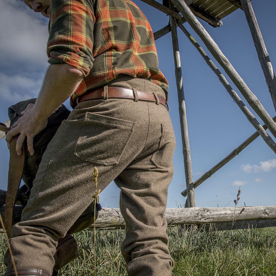 Geschlossen wird die Loden-Jagdhose durch Knopf und Haken und bietet so im Verschluss doppelte Sicherheit. Die Gürtelschlaufen passen für Gürtel bis 4cm Breite.