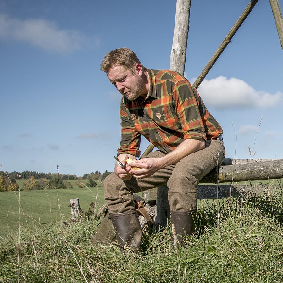 Die Lodenhose „Bux“ ist eine warme und handfeste Jagdhose aus unserem guten 570g-Tuchloden aus reiner Schurwolle. Aufgesetzte Taschen vorne und hinten, sowie eine schmale Messertasche auf der rechten Seite bieten Platz für kleinere Dinge und warme Hände.Die Kniepartie ist durch Abnäher in eine ergonomische Form gebracht, die beim Laufen und Knien gute Bewegungsfreiheit gewährt. Das Knie ist nicht nur der am stärksten beanspruchte Bereich einer Hose, sondern im Sitzen auch sehr exponiert, weil der Stoff dort glatt aufliegt. Es ist die Stelle, an der sich beim Ansitz am schnellsten die Kälte ausbreitet und in die Gelenke zieht. Das sind gleich zwei Gründe, warum wir die Kniepartie mit einer zweiten Lodenlage versehen haben.
